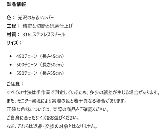 デザイン: 細かく編まれたような、またはしなやかなワイヤーのような、光沢のあるシンプルなチェーンです。