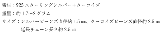 デザイン:華奢なシルバーチェーンに、小さなターコイズカラーのビーズが並んでいます。